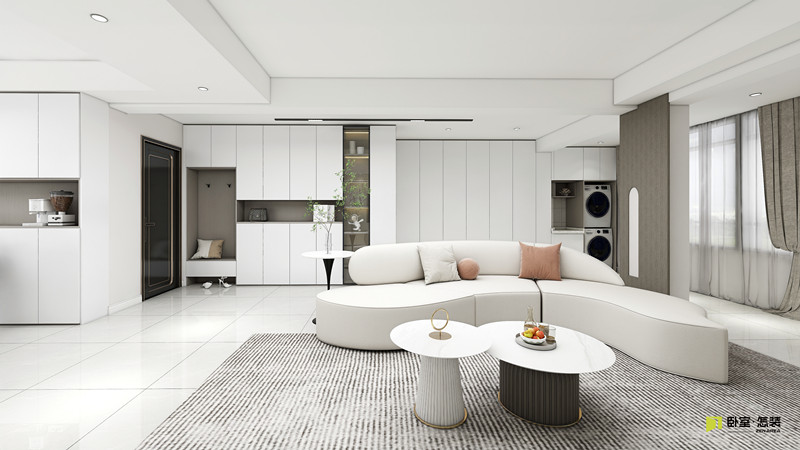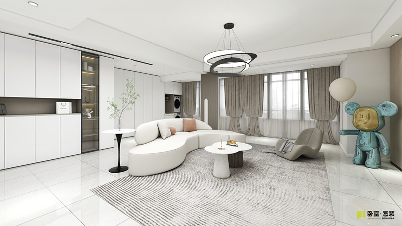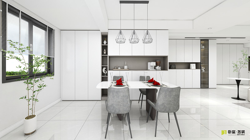 設計理念:這是一套現代簡約風的裝修案例,整體硬裝以灰白作為主色調,運用黑色線條作為點綴,簡潔而利落的設計讓空間更為寬廣通透,形塑現代簡約風格之韻味。同時從功能出發,講究生活的舒適、空間結構的明確美觀,強調外觀的簡潔大方。其中白色櫃體的運用起到至關重要的作用,是整體現代簡約風的主體色彩,也是靈魂所在。