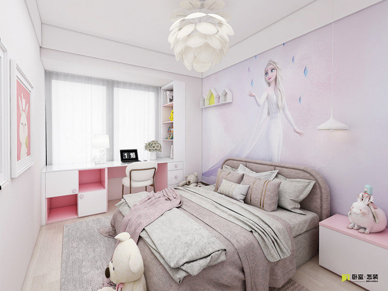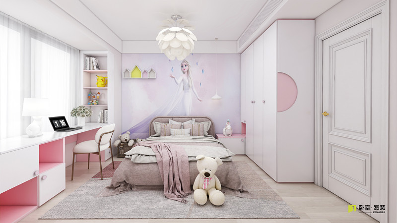 ▲ 粉色係的愛莎主題公主房,陽光但不嬌弱。每個小女孩都有個粉色的公主夢,為緩和全屋粉色的壓力,定製白色的櫃子緩衝,為培養孩子的自理能力。書櫃與書桌相結合的設計,經濟又實用。