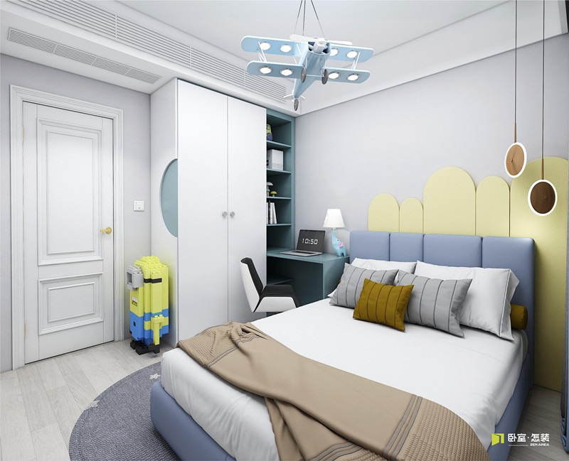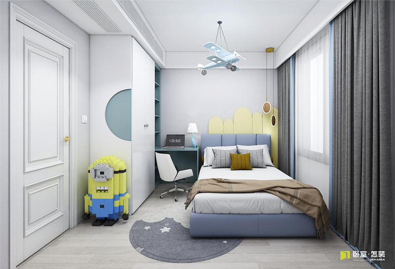 ▲ 男孩房采用的是小黃人主題,以白色作為主基調,搭配黃綠色點綴,使空間多了一份俏皮的元素,為孩子的童年留下一段美好的回憶。