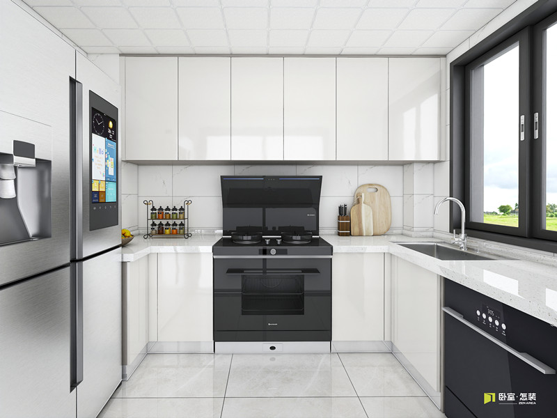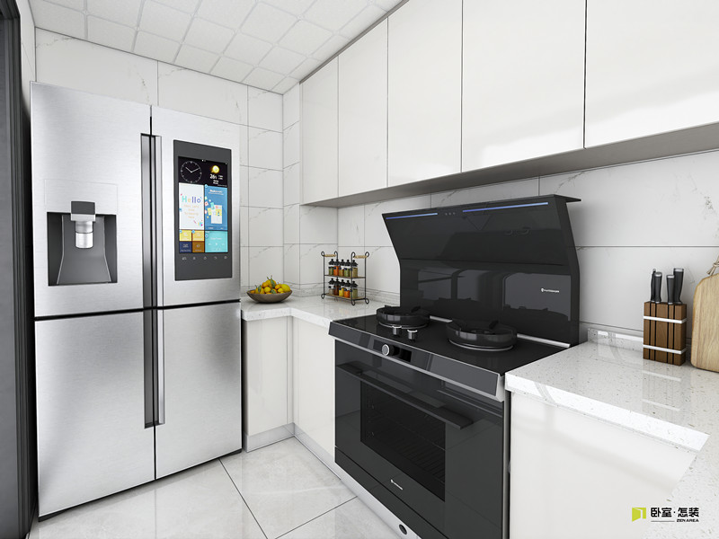 ▲ 廚房櫥櫃及吊櫃延用客廳的白色,但是采用的是PET門板,無毒無害,非常環保,甚至可達到食品級,易清潔且可以輔助采光,耐潮濕耐高溫,使用年限長。
